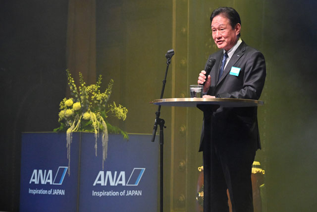 ストックホルムで開かれたガラパーティーであいさつするANAの井上慎一社長=25年2月4日 PHOTO: Tadayuki YOSHIKAWA/Aviation Wire