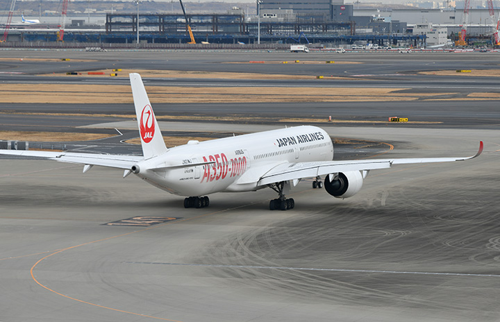 羽田空港113番スポットを出発しA滑走路へ向かうJALのシンガポール行きJL37便に投入したA350-1000初号機JA01WJ=25年2月12日 PHOTO: Yusuke KOHASE/Aviation Wire