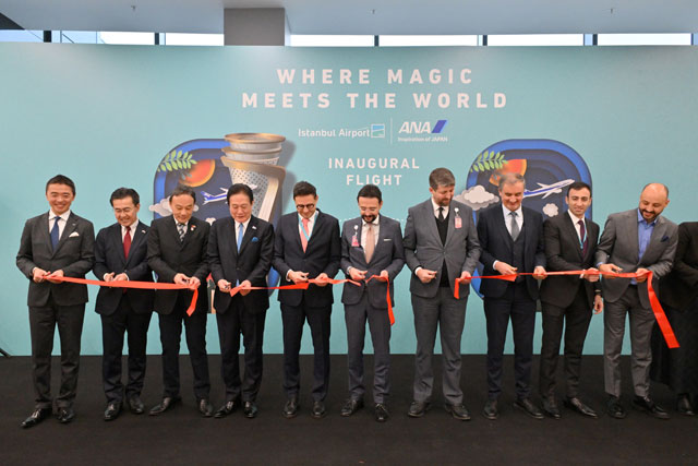 イスタンブール空港で開かれた就航記念式典でテープカットするANAの井上慎一社長ら=25年2月12日 PHOTO: Tadayuki YOSHIKAWA/Aviation Wire