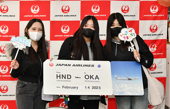 JALの那覇行きJL909便が出発する羽田空港11番搭乗口で記念撮影に応じる修学旅行生=25年2月14日 PHOTO: Yusuke KOHASE/Aviation Wire