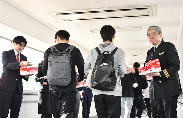 羽田空港で那覇行きJL909便の乗客にバレンタインデーのチョコレートをプレゼントするJALのパイロットら=25年2月14日 PHOTO: Yusuke KOHASE/Aviation Wire