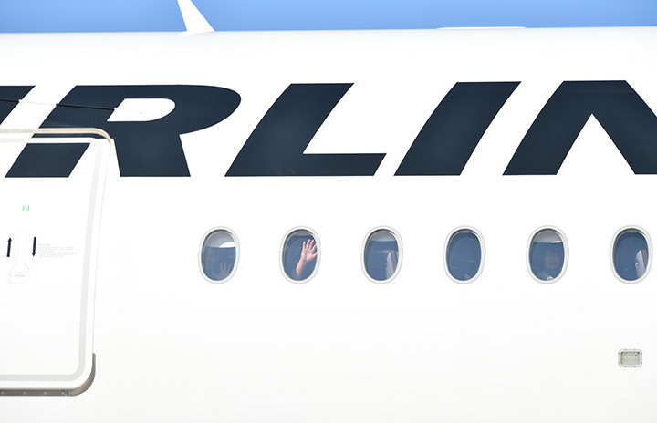 羽田空港を出発する那覇行きJL909便の機内から手を振る乗客=25年2月14日 PHOTO: Yusuke KOHASE/Aviation Wire