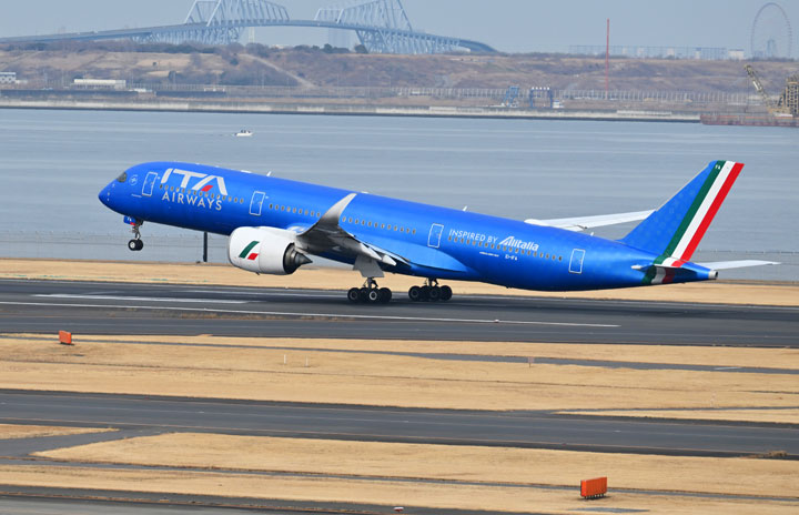 羽田空港を離陸するアリタリアのロゴを描いたITAエアウェイズのA350-900によるローマ行きAZ793便=25年2月16日 PHOTO: Tadayuki YOSHIKAWA/Aviation Wire