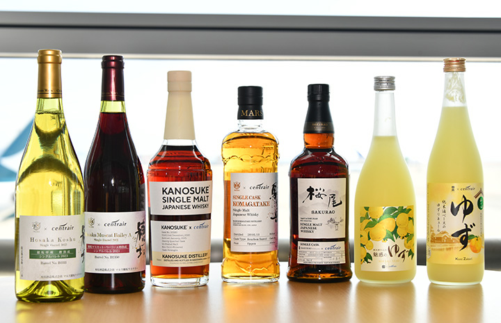 中部空港開港20周年を記念し販売する限定酒。(左から)ワイン、ウイスキー、ユズ酒=25年2月17日 PHOTO: Yusuke KOHASE/Aviation Wire