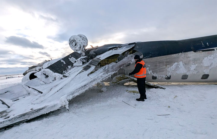 トロントで着陸後に横転したエンデバー航空DL4819便のCRJ900(カナダ運輸安全委員会提供)