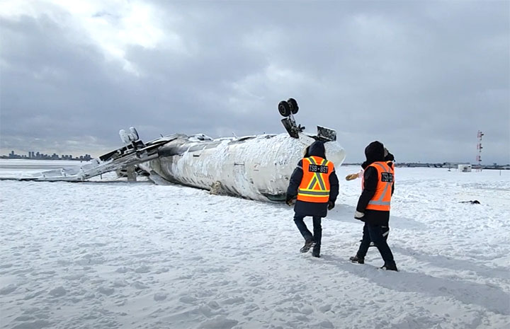 トロントで着陸後に横転したエンデバー航空DL4819便のCRJ900(カナダ運輸安全委員会提供)