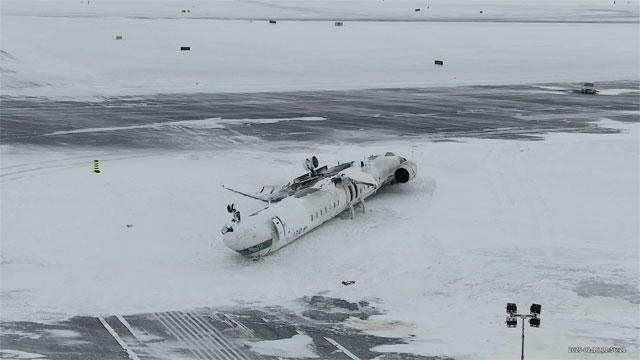 トロントで着陸後に横転したエンデバー航空DL4819便のCRJ900の空撮映像(カナダ運輸安全委員会提供)