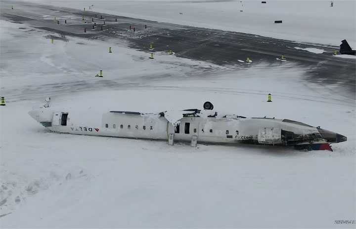 トロントで着陸後に横転したエンデバー航空DL4819便のCRJ900の空撮映像(カナダ運輸安全委員会提供)