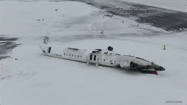 トロントで着陸後に横転したエンデバー航空DL4819便のCRJ900の空撮映像(カナダ運輸安全委員会提供)