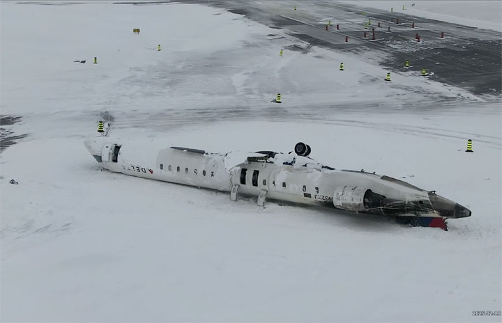 トロントで着陸後に横転したエンデバー航空DL4819便のCRJ900の空撮映像(カナダ運輸安全委員会提供)