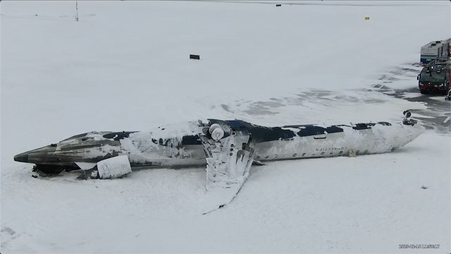 トロントで着陸後に横転したエンデバー航空DL4819便のCRJ900の空撮映像(カナダ運輸安全委員会提供)