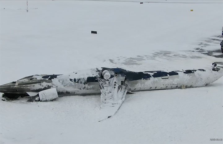 トロントで着陸後に横転したエンデバー航空DL4819便のCRJ900の空撮映像(カナダ運輸安全委員会提供)