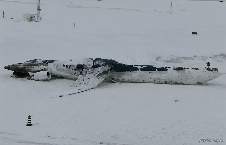 トロントで着陸後に横転したエンデバー航空DL4819便のCRJ900の空撮映像(カナダ運輸安全委員会提供)