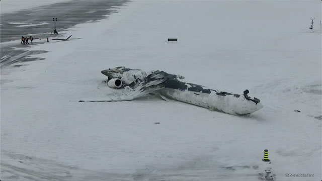 トロントで着陸後に横転したエンデバー航空DL4819便のCRJ900の空撮映像(カナダ運輸安全委員会提供)