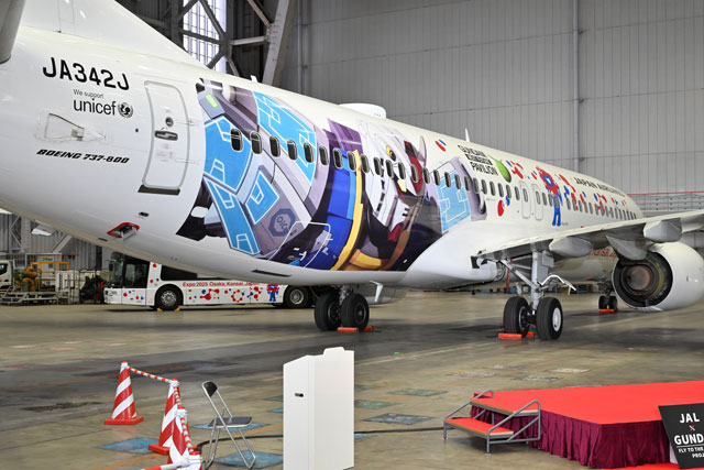 羽田空港でお披露目されたJALガンダムJET=25年3月3日 PHOTO: Tadayuki YOSHIKAWA/Aviation Wire