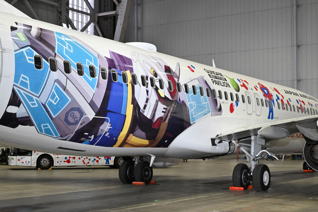 羽田空港でお披露目されたJALガンダムJET=25年3月3日 PHOTO: Tadayuki YOSHIKAWA/Aviation Wire