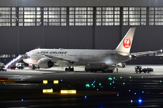 羽田空港の214番スポットへ到着したシアトルで接触事故を起こしたJALの787-9 JA868J=25年3月7日 PHOTO: Tadayuki YOSHIKAWA/Aviation Wire