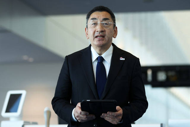 羽田空港第2ターミナルの本館とサテライトを結ぶ接続部について説明する全日本空輸 東京空港支店長 兼 ANAエアポートサービス社長の勝岡陽一氏=25年3月10日 PHOTO: Kiyoshi OTA/Aviation Wire