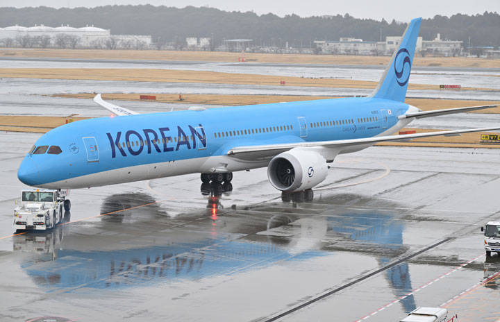 成田空港を出発する大韓航空の新デザイン初号機787-10によるソウル行きKE704便=25年3月12日 PHOTO: Tadayuki YOSHIKAWA/Aviation Wire