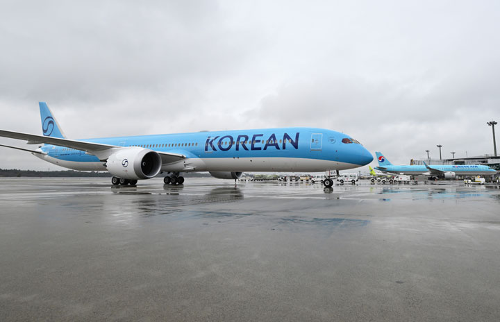 成田空港に到着する大韓航空の新デザイン初号機787-10によるソウル発KE703便(手前)と旧塗装のA321neo=25年3月12日 PHOTO: Tadayuki YOSHIKAWA/Aviation Wire