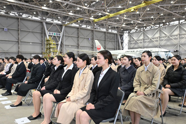 羽田空港の格納庫で開かれたJALグループの入社式に出席する新入社員=25年4月1日 PHOTO: Tadayuki YOSHIKAWA/Aviation Wire