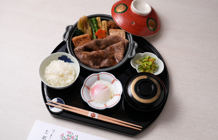 スターラックス航空の成田発ファーストクラスで提供するメインのすき焼き(同社提供)