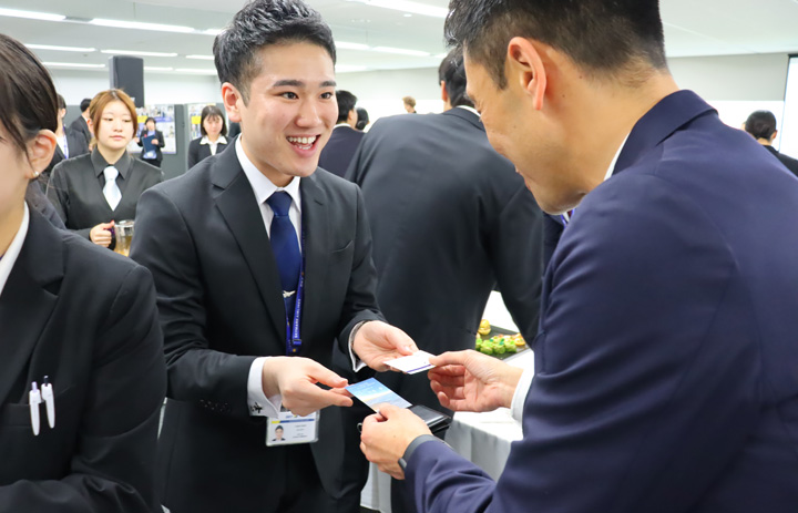 入社式後の懇親会で名刺交換する新入社員(同社提供)