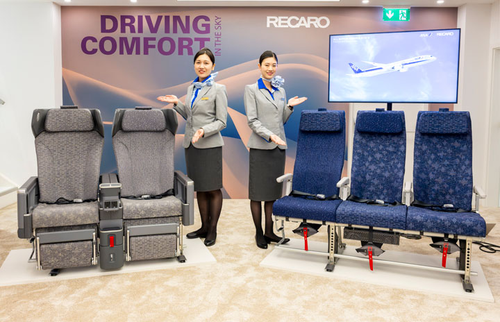 787-9国際線仕様機に搭載するレカロ製プレミアムエコノミー(左)とエコノミークラスの新シートをハンブルクでお披露目するANAの客室乗務員(ANA提供)