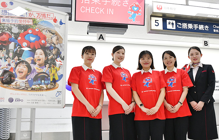 ミャクミャクをデザインしたオリジナルTシャツを着用する成田空港のJALスカイ地上係員=25年4月11日 PHOTO: Yusuke KOHASE/Aviation Wire