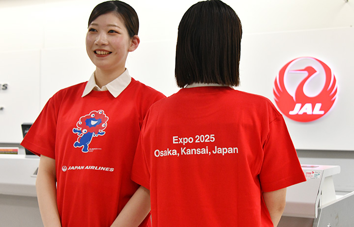 ミャクミャクをデザインしたオリジナルTシャツを着用する成田空港のJALスカイ地上係員=25年4月11日 PHOTO: Yusuke KOHASE/Aviation Wire