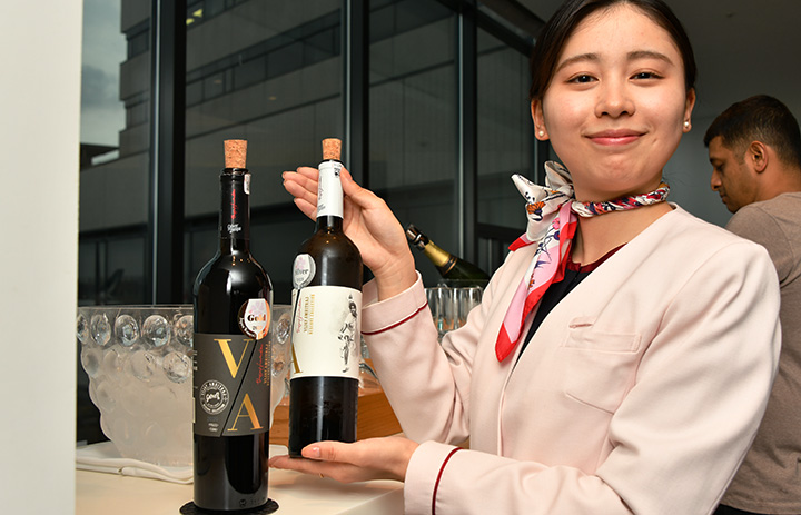 提供するインド産のワイン「ビジャイ・アムリットラージ リザーブコレクション」を手にするJALサクララウンジのスタッフ=25年4月11日 PHOTO: Yusuke KOHASE/Aviation Wire