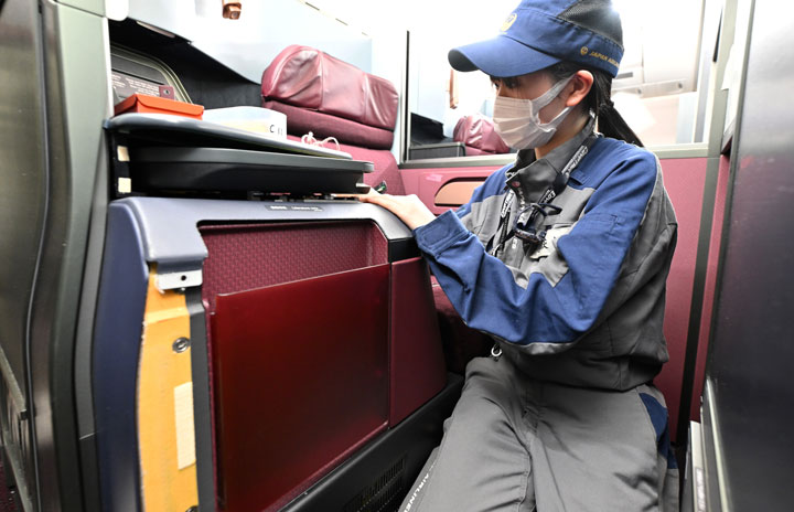 JALのA350-1000初の重整備を受ける2号機JA02WJの個室タイプのビジネスクラスを整備する整備士=25年4月14日 PHOTO: Tadayuki YOSHIKAWA/Aviation Wire