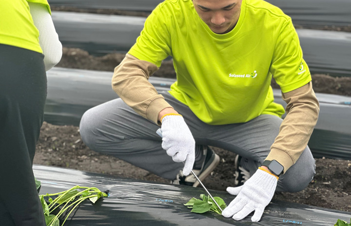 「ソラシドファーム枕崎」にサツマイモの苗を植え付けるソラシドの社員(同社提供)