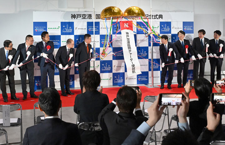神戸空港第2ターミナルで開かれた国際チャーター便就航記念式典でくす玉を割る神戸市の久元喜造市長ら=25年4月18日 PHOTO: Tadayuki YOSHIKAWA/Aviation Wire