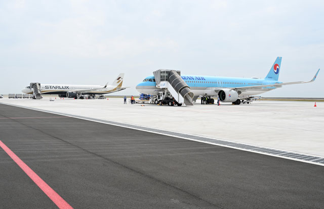 神戸空港へ到着した大韓航空のソウル仁川発KE731便(手前)とスターラックス航空の台北桃園発JX834便=25年4月18日 PHOTO: Tadayuki YOSHIKAWA/Aviation Wire