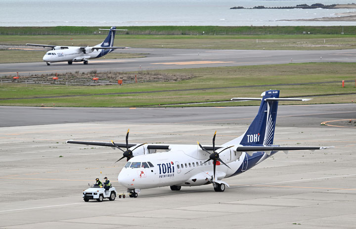 スポットへトーイングされるトキエアの3号機ATR42(手前)と離陸する初号機ATR72=25年4月24日 PHOTO: Daigo TAKENOBU/Aviation Wire