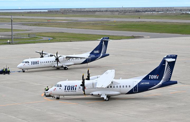 スポットへトーイングされるトキエアの3号機ATR42(手前)と駐機中の2号機ATR72=25年4月24日 PHOTO: Daigo TAKENOBU/Aviation Wire