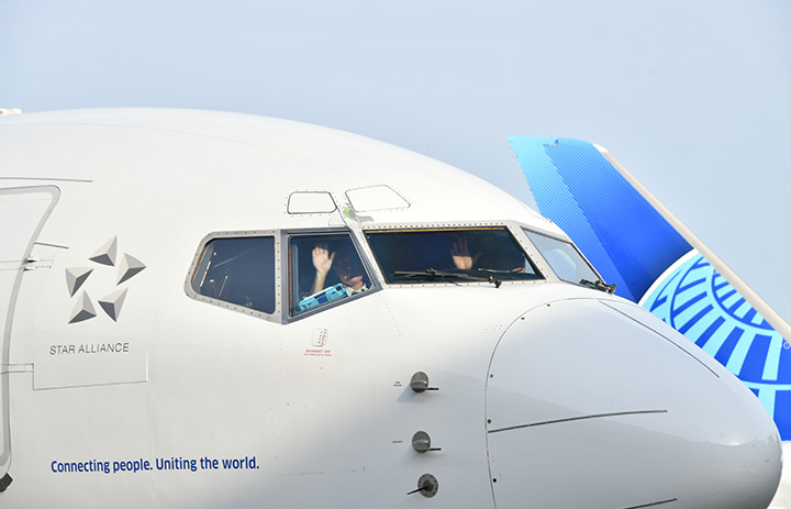 成田空港を出発するウランバートル行きUA7便初便のコックピットから手を振るユナイテッド航空のパイロット=25年5月1日 PHOTO: Yusuke KOHASE/Aviation Wire