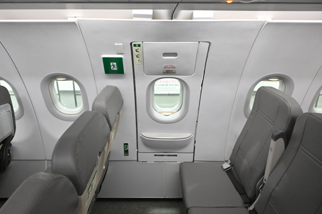 ピーチの複合訓練施設「モモトレ」のA320実機を改修した客室モックアップに設置されたA321タイプの非常口=25年7月31日 PHOTO: Tadayuki YOSHIKAWA/Aviation Wire