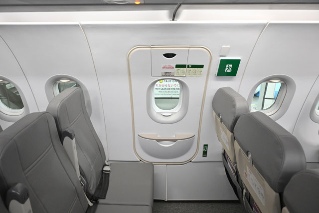 ピーチの複合訓練施設「モモトレ」のA320実機を改修した客室モックアップに設置されたA320タイプの非常口=25年7月31日 PHOTO: Tadayuki YOSHIKAWA/Aviation Wire