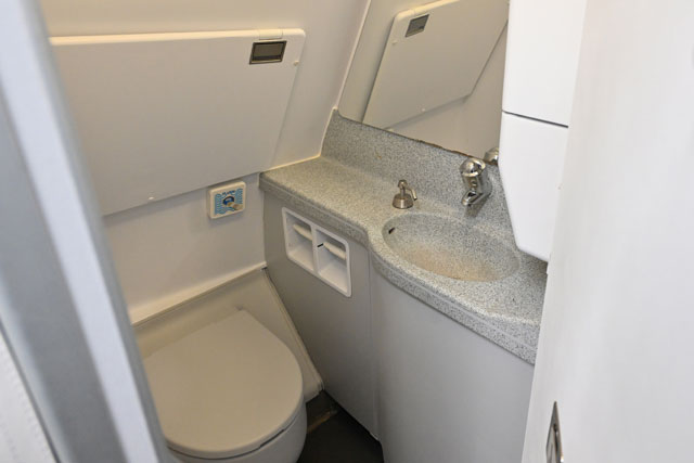 ピーチの複合訓練施設「モモトレ」のA320実機を改修した客室モックアップに設置されたラバトリー=25年7月31日 PHOTO: Tadayuki YOSHIKAWA/Aviation Wire