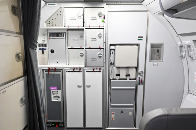 ピーチの複合訓練施設「モモトレ」のA320実機を改修した客室モックアップに設置されたギャレー=25年7月31日 PHOTO: Tadayuki YOSHIKAWA/Aviation Wire