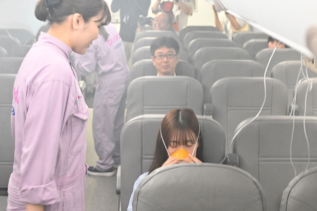 ピーチの複合訓練施設「モモトレ」の客室モックアップで行われた客室乗務員の訓練デモンストレーション=25年7月31日 PHOTO: Tadayuki YOSHIKAWA/Aviation Wire