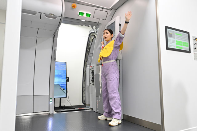 ピーチの複合訓練施設「モモトレ」のドアトレーナーで訓練デモンストレーションを披露する客室乗務員=25年7月31日 PHOTO: Tadayuki YOSHIKAWA/Aviation Wire