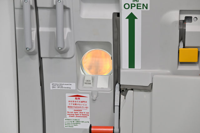 火災をモニターで再現したピーチの複合訓練施設「モモトレ」のドアトレーナー=25年7月31日 PHOTO: Tadayuki YOSHIKAWA/Aviation Wire