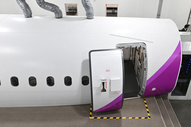 ピーチの複合訓練施設「モモトレ」のA320実機を改修した客室モックアップ=25年7月31日 PHOTO: Tadayuki YOSHIKAWA/Aviation Wire