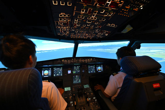 ピーチの複合訓練施設「モモトレ」のFTDでフライト訓練を披露するパイロット=25年7月31日 PHOTO: Tadayuki YOSHIKAWA/Aviation Wire