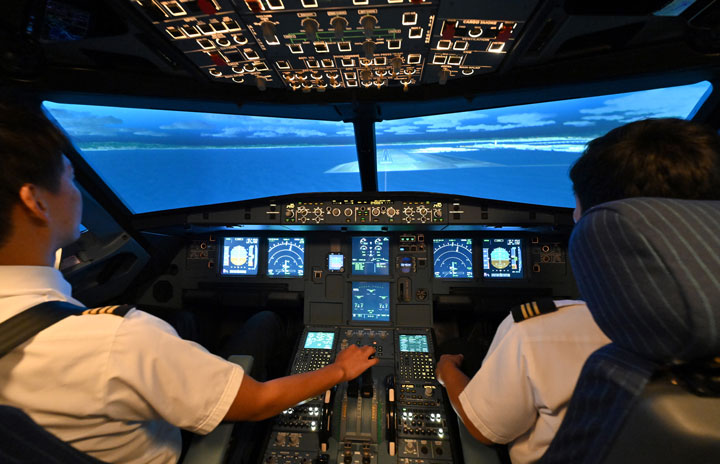 ピーチの複合訓練施設「モモトレ」のFTDでフライト訓練を披露するパイロット=25年7月31日 PHOTO: Tadayuki YOSHIKAWA/Aviation Wire