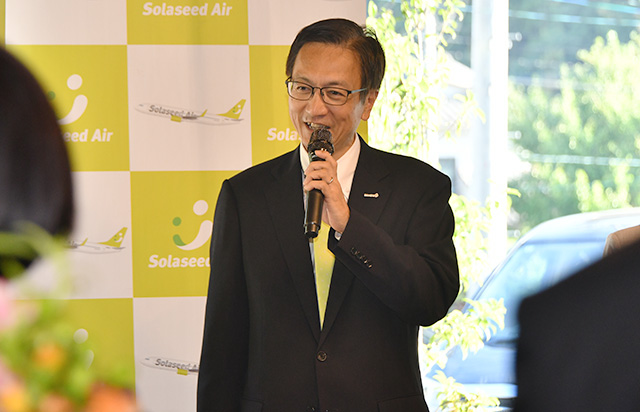 波佐見町のレストラン「御堂舎」で開いた長崎就航20周年の集いで感謝を述べるソラシドエアの山岐社長=25年8月1日 PHOTO: Yusuke KOHASE/Aviation Wire