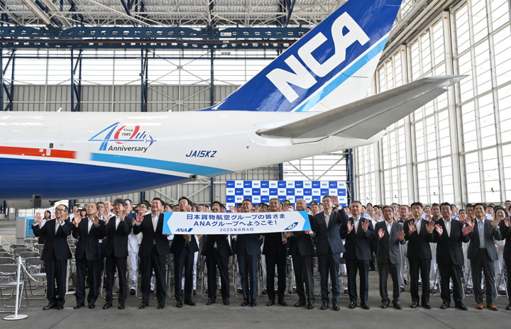 NCAのANAグループ入りを祝う歓迎式典で社員と記念撮影するANAホールディングスの芝田浩二社長とNCAの本間啓之社長ら=25年8月4日 PHOTO: Tadayuki YOSHIKAWA/Aviation Wire